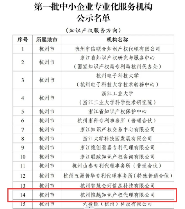 喜報!!關于杭州惟越知識產權代理有限公司入選浙江省首批中小企業(yè)專業(yè)化服務機構的公示